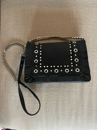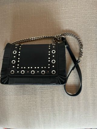 Bolso de mano o bandolera de Zara en color negro. Presenta un diseño moderno con flecos y detalles de tachuelas metálicas. - Cierre de solapa. - Correa de cadena. - Asa corta de mano.