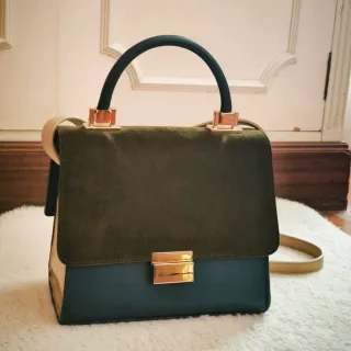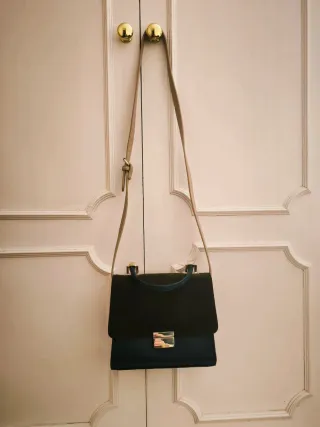 Bolso de mano para mujer de Zara. - En color azul, verde y beige. - Detalles metálicos doradod. - Asa superior y correa ajustable.
