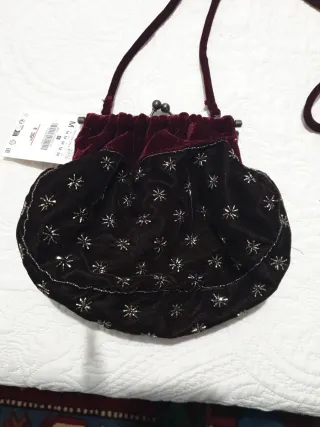Bolso pequeño de terciopelo con un diseño encantador. - Adornado con pequeñas incrustaciones plateadas en forma de estrella. - Cierre de broche metálico. - Asa de terciopelo a juego.