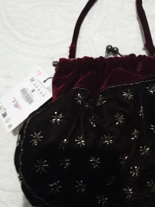 Elegante bolso de Zara con un diseño llamativo y adornos. - Base de terciopelo negro. - Adornos bordados y espejos. Algunos están con cierto desgaste (como se ve en las fotos). - Cadena metálica para llevar al hombro.