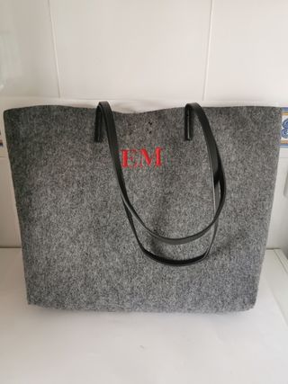 Bolso grande de fieltro en color gris con letras bordadas en color rojo. Las asas son en color negro de polipiel y dentro tiene un pequeño bolso en color negro con cremallera, unido al bolso. Caben un montón de cosas y fácil de combinar con cualquier ouffit. En perfecto estado.