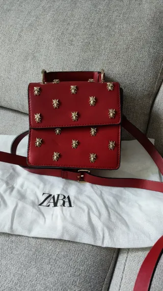 Bolso bandolera de Zara en color rojo, adornado con detalles dorados. - Diseño cuadrado. - Adornos en forma de abeja dorada. - Asa corta superior. - Correa larga ajustable.