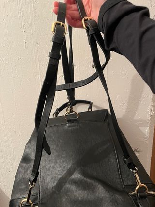 Mochila de la marca Zara en color negro con detalles metálicos dorados. - Cierre principal con cremallera. - Hebilla frontal decorativa. - Bolsillos exteriores con broches. - Correas ajustables.