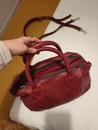 Bolso de piel de la marca Zara en color granate con correa para llevar cruzado. - Material: Piel. - Color: granate. - Cierre: Cremallera. - Incluye correa ajustable para llevar al hombro.