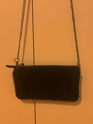 Mini bolso de Zara, ideal para llevar el teléfono móvil. Su diseño combina un acabado en ante con detalles de tachuelas plateadas. - Cierre de cremallera. - Cadena metálica. - Acabado en ante.
