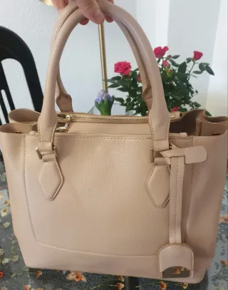 Bolso de mano de la marca Zara en color beige. Diseño elegante y espacioso. - Material con textura. - Cierre de cremallera. - Asa de mano. - Detalle de colgante.