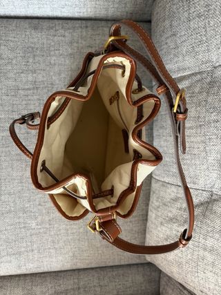 Bolso tipo bombonera con detalles en piel sintética - Material exterior de lona beige - Ribetes y base de piel sintética marrón - Cierre de cordón ajustable - Correa de hombro de piel sintética Muy poco utilizado