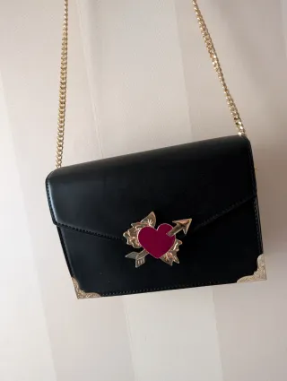 Elegante bolso de mano de Zara con un diseño llamativo. - Acabado en piel sintética negra. - Adorno frontal con corazón y flecha en dorado. - Cadena dorada para llevar al hombro o cruzado. - Esquinas reforzadas con detalles metálicos dorados.