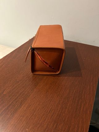 Neceser de Zara Home con un diseño moderno y práctico. - Material: Piel sintética. - Color: Tonos marrones y naranjas. - Medidas: Ancho 21 cm Alti 10 cm