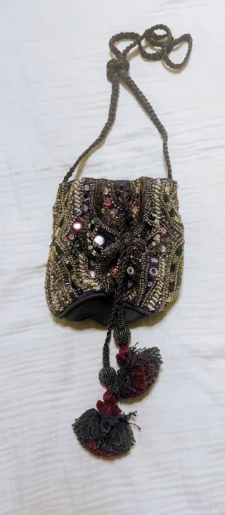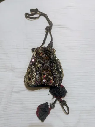 Bolso de mano con un diseño muy elaborado y lleno de detalles. - Adornado con pedrería y lentejuelas. - Incluye borlas decorativas. - Cierre de cordón ajustable. Idean para tonos marrones para dar un toque a la vestimenta ñ.