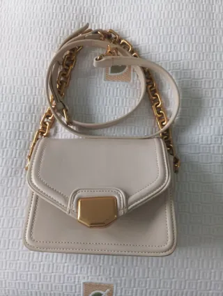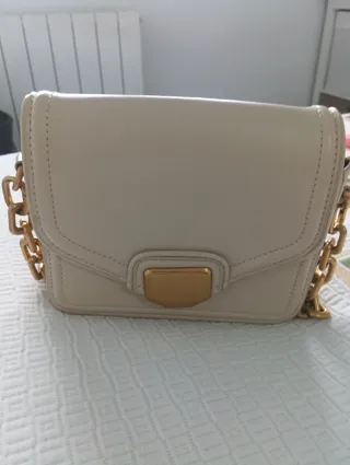 Elegante bolso de mano de la marca Zara. - Color beige con detalles dorados. - Asa de cadena dorada. - Cierre de solapa con broche metálico.
