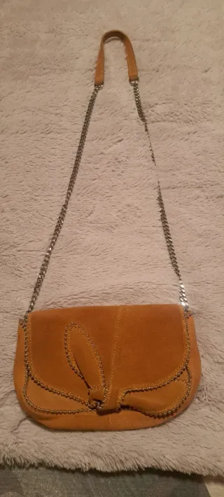Es mas bien color mostaza claro, sin apenas uso, ajustable. 14 x 20 cm, se puede usar de cartera xq se quita la correa.