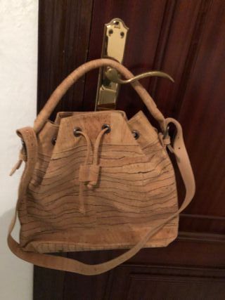 Bolso de señora de piel. - Material exterior de ante. - Cierre de giro metálico. - Asa de mano. - Detalle de etiqueta colgante con el logo.