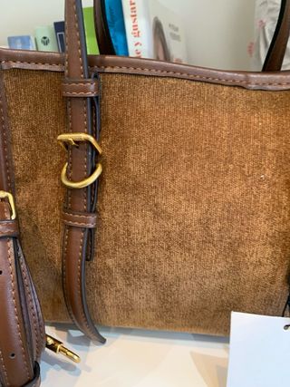 Bolso de mano de la marca Zara, con un diseño elegante y moderno. Es un accesorio perfecto para el día a día. - Material exterior de pana. - Asas de piel. - Incluye correa para llevar al hombro. - Cierre de broche.