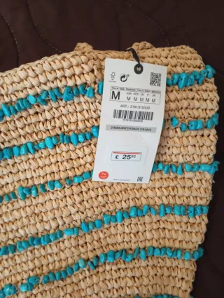 Bolso shopper de Zara con un diseño trenzado y un detalle de abalorio. - Cuerpo principal tejido. - Cierre de cremallera. - Correa de hombro ajustable con nudos. - Adorno de cuentas doradas y marrones. No es de piel.