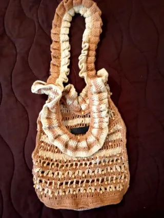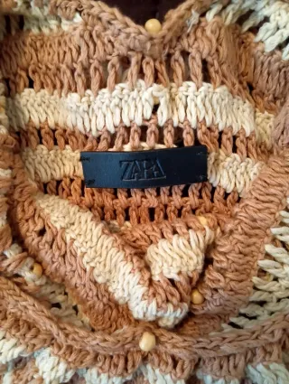 Bolso de Zara con un diseño tejido en tonos beige y marrón. Incorpora detalles de cuentas de madera. - Tejido de punto. - Cuentas de madera.