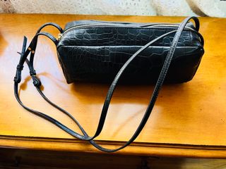Bolso negro con grabado efecto coco, diseño atemporal y muy combinable. Ideal para uso diario o para ocasiones más arregladas. Marca: ZARA Color: negro Material: efecto piel con textura cocodrilo Cierre superior con cremallera dorada Asa larga ajustable para llevar al hombro o cruzado Interior amplio para lo esencial (móvil, cartera, llaves, etc.) 📌 Estado: SIN ESTRENAR. Cremallera y costuras perfectas. Un bolso elegante, práctico y fácil de combinar con cualquier look.