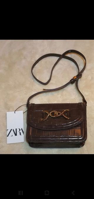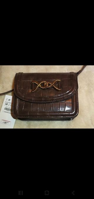 Nuevo con etiquetas, bolso marrón Zara efecto piel de cocodrilo, con adorno dorado.
