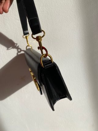 Bolso negro mini con un bolsillo en el interior. Lleva asas de mano con función de bandolera ajustable y extraíble y cadena dorada. Bolso de piel negro. Poco uso.