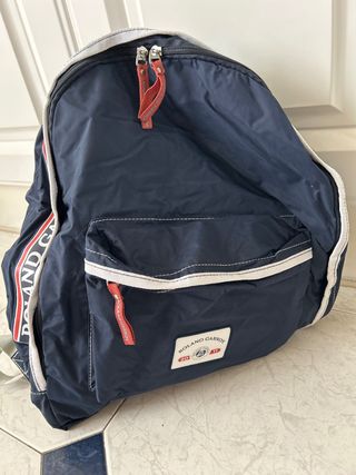 Mochila con diseño deportivo y práctico, perfecta para llevar tus pertenencias. - Cierre principal con cremallera. - Bolsillo frontal con cremallera. - Tira de cinta con logo en el lateral. - Tiradores de cremallera con detalle de color.
