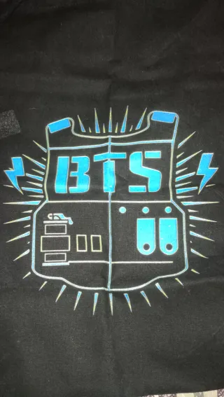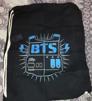 Mochila con diseño inspirado en BTS. - Color principal negro. - Detalles en color azul. - Cierre de cordón Mochila en perfecto estado, sin estrenar