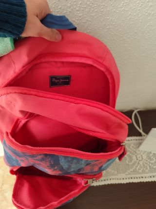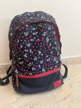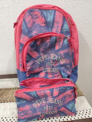 Mochila Pepe Jeans en tonos azul y rosa. Está en buen estado y es perfecta para el día a día. - Diseño con estampado de corazones. - Compartimento principal con cierre de cremallera. - Bolsillos adicionales con cremallera. - Asa superior para llevarla en la mano. - Correas acolchadas para mayor comodidad.