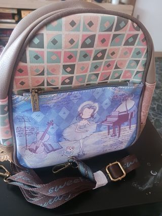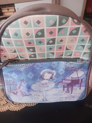 Mochila de la marca gorjuss santoro, lleva varios compartimentos por dentro, 2 pequeños y uno grande y por detrás uno grande cerrado con cremallera, en las fotos muestro que en el bajo en los lados lleva un pequeño rocecito que apenas se aprecia es de cuero sintético.