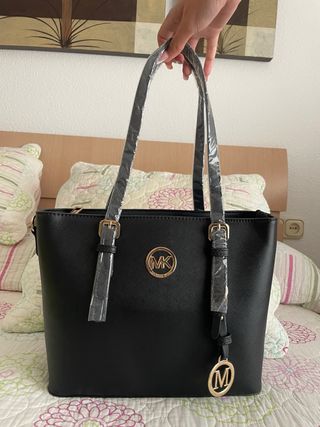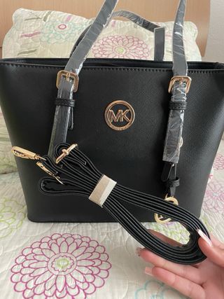 Elegante bolso Michael Kors. - Diseño en color negro con detalles dorados. - Asa con hebilla ajustable. - Colgante con logo metálico.