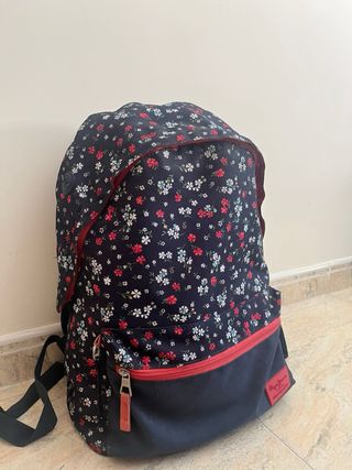 Mochila con un bonito estampado floral sobre fondo azul marino. Presenta detalles en rojo que le dan un toque vibrante. - Diseño con múltiples compartimentos. - Cierre de cremallera. - Logo de la marca visible.