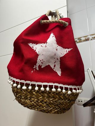 Bolso de paja con un diseño veraniego y detalles brillantes. - Decoración central en forma de estrella. - Estrella adornada con lentejuelas doradas. - Ribete de flecos y cuentas alrededor de la estrella. - Asas de cuero sintético.