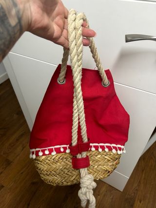 Bolso de mano tejido con un diseño de paja natural y detalles en cuero. - Material: Paja y cuero. - Color: Beige y marrón. - Cierre de cordón ajustable. - Asas de cuero cómodas.