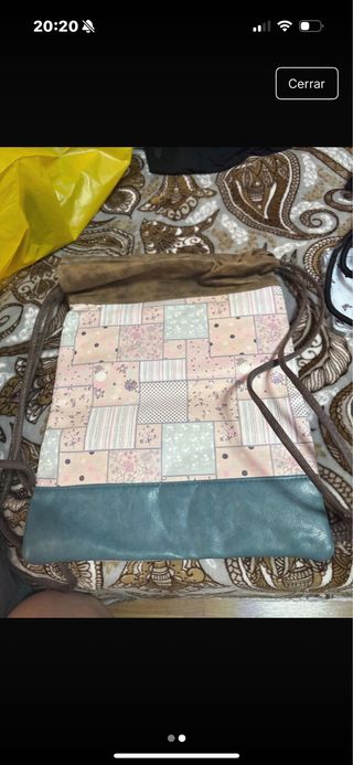 Mochila con un diseño único y material natural. - Exterior hecho de corcho. - Bolsillo frontal con estampado geométrico y étnico en tonos azules, rosas y ocres. - Cierre de cremallera en el bolsillo frontal. Bolsillo interior con cremallera. Interior textil. Tirantes regulables 32x39x11cm. Un tirante descosido, pequeño descosido en la zona del tirante. Por lo demás en perfecto estado
