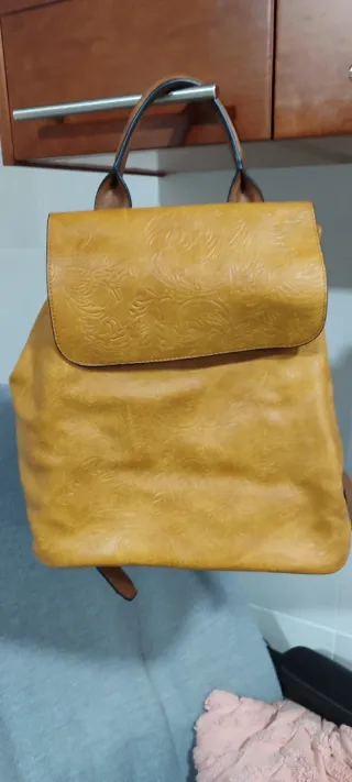 Mochila de estilo casual con un bonito diseño floral en relieve. Es un accesorio práctico y a la moda. - Material: Piel sintética. - Color: mostaza y marrón. - Cierre de solapa.