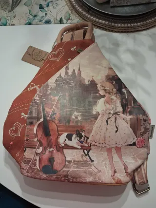Mochila con un diseño único y artístico, perfecta para añadir un toque especial a tu día a día. Presenta una encantadora ilustración de una niña, un violín y un perro. - Con etiqueta (nueva) - Cierre principal con cremallera. - Correas ajustables para mayor comodidad. - Asa superior para llevarla en la mano. - Detalles de costuras y corazones en la parte lateral. Cuesta 35€