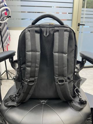 Mochila diseñada para barberos, con un compartimento principal y bolsillos exteriores. - Compartimento principal espacioso. - Bolsillos laterales de malla. - Asa superior acolchada. - Cierres de cremallera dorados.