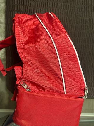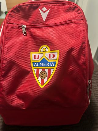 Mochila oficial del UD Almería, con el escudo del equipo. - Color rojo. - Diseño con el logo de Macron. - Varios compartimentos con cremallera.