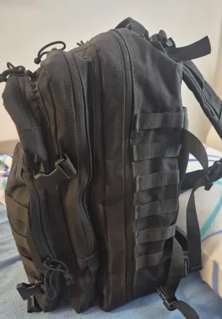 Mochila de estilo táctico con múltiples compartimentos y correas. - Diseño modular con sistema MOLLE. - Compartimento principal espacioso. - Bolsillos frontales adicionales. - Correas de hombro acolchadas y ajustables. - Asa de transporte superior.