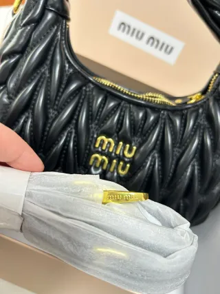 Elegante bolso Miu Miu con un diseño acolchado y detalles dorados. - Acabado en piel negra. - Cremallera dorada. - Logo Miu Miu en relieve.