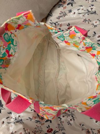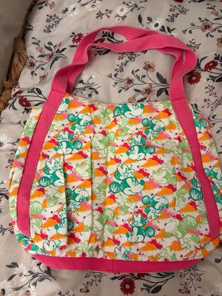 Bolso con estampado de Mickey Mouse y nubes de colores. - Diseño alegre y llamativo. - Asas de tela rosa. - Ribete inferior y lateral en color rosa.