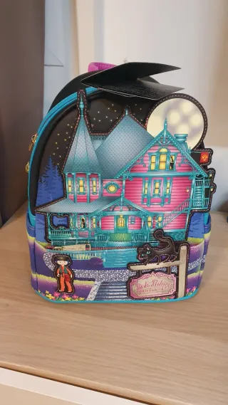 Mochila inspirada en la película Coraline, con el diseño de la Casa del Palacio Rosa. - Detalle de la casa con escaleras y el gato negro. - Personaje de Coraline en la parte inferior. - Luna llena y estrellas en el fondo.