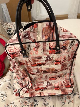 Maleta de viaje con un diseño original y llamativo, perfecta para tus escapadas. - Estampado con motivos de viajes, incluyendo autobuses, coches y la Torre Eiffel. - Ruedas para facilitar su transporte. - Asas resistentes para llevarla cómodamente.