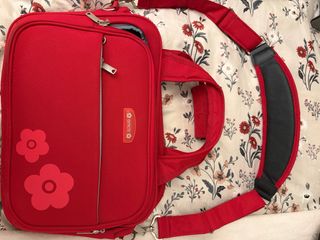 Neceser de viaje con un diseño alegre y práctico. - Color rojo vibrante. - Adornado con dos flores. - Incluye etiqueta de la marca Amichi. -se puede colgar en mango de maleta -3 compartimentos