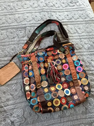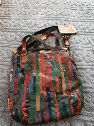 Gran bolso de mano y hombro con un diseño único y llamativo. - Elaborado con retales de cuero en diversos colores. - Detalle de flecos decorativos. - Incluye un pequeño monedero a juego.