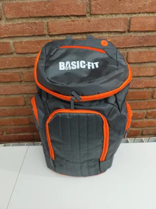 Mochila d Basic-Fit con un diseño moderno y práctico. A estrenar, sin uso - Color gris con detalles en naranja. - Compartimento principal con cierre de cremallera. - Bolsillo frontal con cremallera. - Bolsillos laterales.