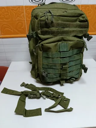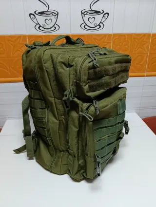 Mochila de estilo táctico militar en color verde oliva. Cuenta con múltiples compartimentos y correas para organizar tu equipo. Nylon resistente de alta densidad, gran calidad. - Diseño con sistema MOLLE. - Cremalleras resistentes. - Correas de hombro ajustables. - Capacidad 45 l. - Medidas 50 x 32 x 28 - Soporte de espalda transpirable.