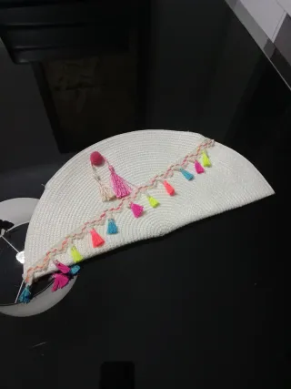Bolso de playa con un diseño llamativo y original. - Adornado con una tira de flecos de colores. - Detalle de pompón rosa. - Material tejido blanco.