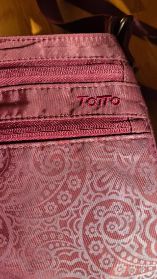 Bandolera Totto en color burdeos, con estampado Paisley a tono en la parte delantera, para un acabado original y elegante. Multiples bolsillos: dos con cremallera en el frente y uno en el interior, así como uno con botón magnético en la parte trasera y dos compartimentos para pequeños objetos en el interior. Correa ajustable. Tiradores de cremallera y remates de la correa en símil piel, que dan un toque elegante a este práctico bolso