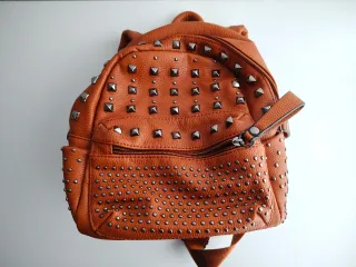 Mochila de estilo urbano con un diseño llamativo. - Acabado en piel sintética. - Decorada con tachuelas metálicas cuadradas y redondas. - Compartimento principal con cremallera. - Bolsillo frontal adicional con cremallera.