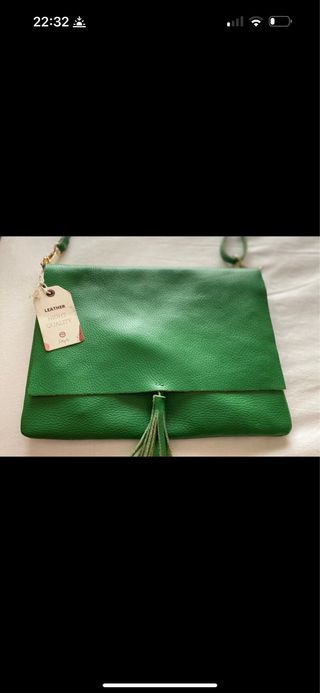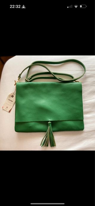 Bolso de piel con un diseño moderno y elegante. Cuenta con un detalle de flecos en la parte frontal. - Material: Piel. - Cierre de solapa. - Correa ajustable. - Correa larga para llevar en bandolera