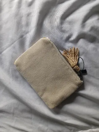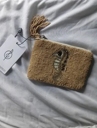 Monedero pequeño con un diseño encantador de caballito de mar bordado con abalorios. - Cierre de cremallera. - Detalle de borla con abalorios. - Adorno de caballito de mar con abalorios plateados y blancos.